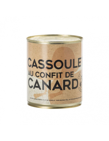 Haricots lingots, confit de canard, saucisse pur porc, eau, capa de bœuf, farine de blé, oignons, sels de Gruissan, lardons, poivre, huile de tournesol, bouillons de poule déshydraté, sels, sirop de glucose, volailles, graisse de poule, viande de poule, extrait de levure, ail, curcuma, caramel, sucre, acidifiants : acide citrique, poivre, extrait de cèleri, antioxydant : extrait de romarin et viande origine France. Peut contenir des traces de lait, sésame et moutarde.