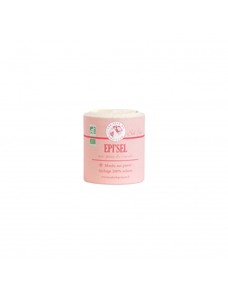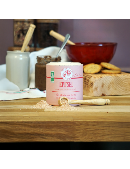 Salière composée de sel fin de mer et d'épices du monde BIO, certifiée FR-BIO-09.