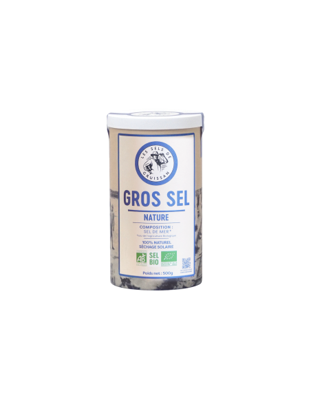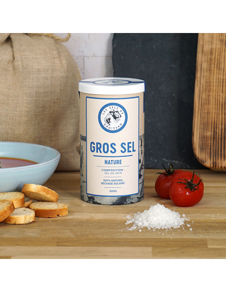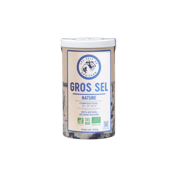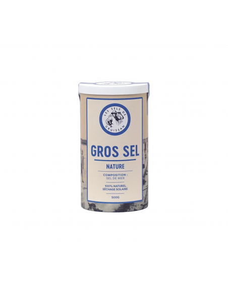 Tube en carton de gros sel de Gruissan de 500g, idéal pour assaisonner vos plats préférés.