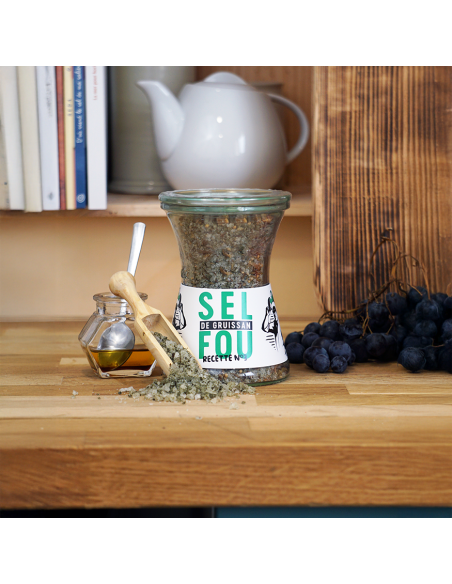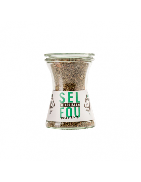 Gros Sel Fou Recette n°3 dans un pot en verre élégant, fusion audacieuse de Sel de Mer, Molokheya, Échalote, Moutarde, et Carvi.