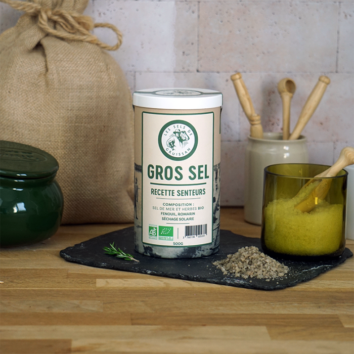 Tube Carton de 500g de Gros Sel "Senteurs" mélangeant Sel de Gruissan et herbes BIO*: Fenouil, et Romarin pour une expérience gustative aromatique.
