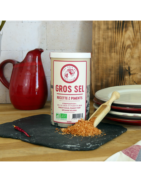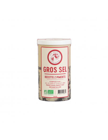 Tube Carton de 500g de Gros Sel "Deux Piments" mariant Sel de Mer et épices BIO : Piment Fort, et Piment Doux, certifiées FR-BIO-09.