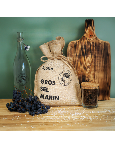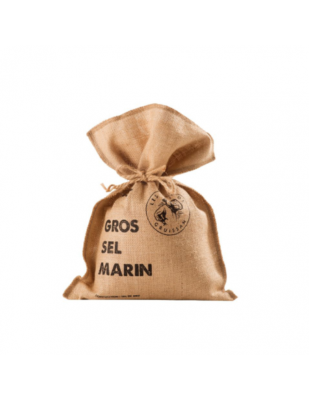 Sac de Gros Sel Naturel de Gruissan de 2.5 kg dans un emballage en jute, matière végétale naturelle ajoutant une touche rustique à votre cuisine.